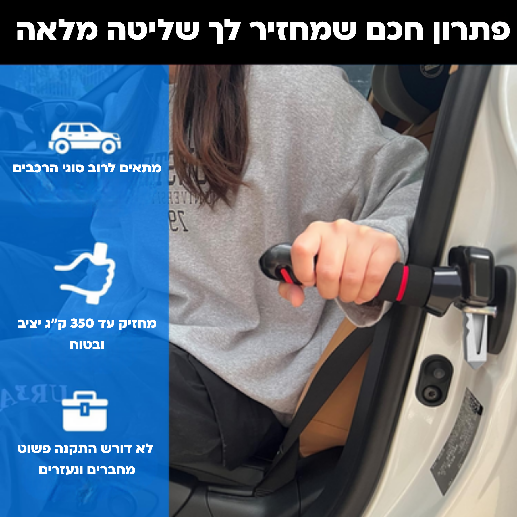 ברגע שאתה מחבר אותה אתה מרגיש את ההבדל מיד. לא עוד מאמץ עם הברכיים, לא חיפוש אחר משהו להיאחז בו. הידית נותנת תמיכה יציבה בדיוק איפה שצריך, ומאפשרת להיכנס ולצאת מהרכב בצורה טבעית ובטוחה. זה הופך פעולה יומיומית למשהו פשוט, בלי חשש ובלי כאבים מיותרים.